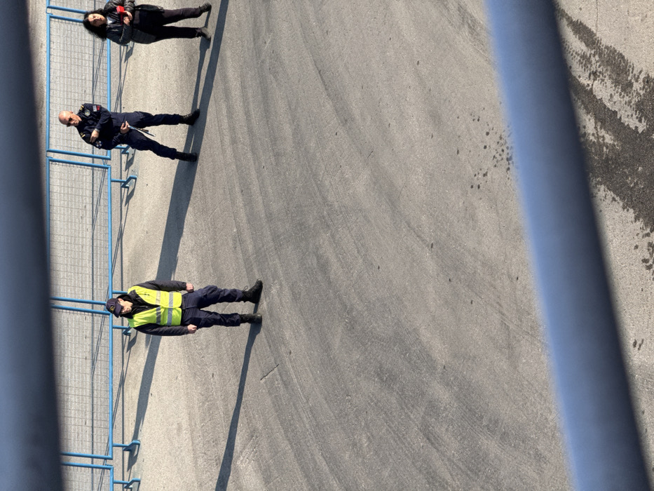 This image depicts an outdoor scene in Kamariotissa, Greece, likely within a port or ferry terminal area. The foreground is partially obscured by a blurry blue horizontal structure, possibly a railing. The ground is a uniform gray paved surface, exhibiting tire marks and scattered dark stains, consistent with asphalt or concrete. Strong sunlight from the upper right casts long shadows of the individuals and structures onto the ground. In the mid-ground, three individuals are standing. From left to right: 1. A male individual wearing a dark blue baseball cap, a dark long-sleeved garment, a bright yellow high-visibility vest, dark blue trousers, and black boots. He stands upright, facing slightly right of the camera, with his arms at his sides. 2. A male individual with a bald head, wearing a dark blue uniform featuring patches on the upper arms/shoulders, dark trousers, and black boots. He holds a light-colored object, possibly a clipboard or tablet, in his left hand, positioned across his midsection. His right arm is bent at the elbow, with his hand near his right shoulder. He stands with legs slightly apart, facing generally towards the camera. 3. A female individual with dark, wavy hair, wearing a dark jacket, dark trousers, and dark shoes. She holds a red cup in her right hand and a small dark object, possibly a phone, in her left hand. She stands with a slight lean, facing generally towards the camera. Behind the individuals, a series of blue metal barriers with wire mesh are arranged horizontally across the scene, extending from left to right. No direct interaction between the individuals is observed; they appear to be standing in proximity within a functional outdoor environment.