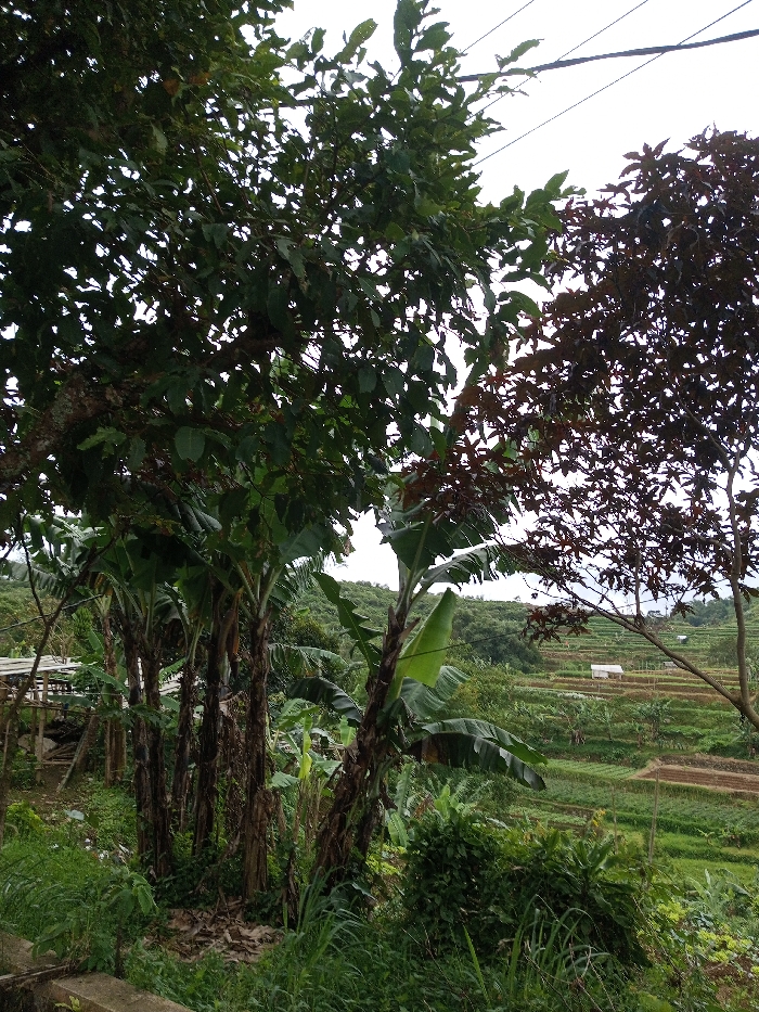 The image presents a rural landscape in Melakudikadu, India, under an overcast sky. The foreground is densely vegetated with tall green grasses and various leafy plants, partially obscuring a concrete or stone base at the bottom left. Multiple banana trees with large green leaves and dark trunks are clustered in the mid-ground, slightly to the left. Behind these trees, a rustic wooden structure, appearing partially built or dilapidated, is visible. To the right, a tree with dark reddish-brown foliage stands. Overhead, large green trees create a dense canopy, with thin utility wires discernable against the pale sky in the upper right quadrant. The background features extensive terraced agricultural fields displaying varying shades of green crops and reddish-brown tilled soil. Two small, white rectangular structures are visible within these distant fields. Green, forested hills form the horizon line. No individuals or animals are present.