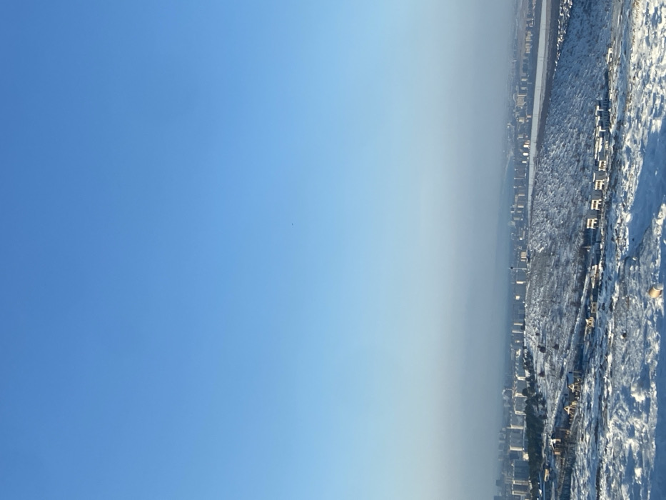 The image displays a panoramic winter vista of Supsekh, Russia, captured from an elevated perspective. The foreground consists of uneven, heavily snow-covered ground, with a white disposable cup visible on the snow in the lower-left quadrant. The midground features snow-blanketed hills sparsely vegetated with leafless trees and shrubs. Several clusters of modern, light-colored buildings with flat roofs are scattered across these slopes. A tall, slender, dark-colored tower structure is present in the mid-right. In the background, the city of Supsekh extends across the horizon, densely packed with numerous multi-story urban buildings. A body of water, likely a bay or river, is visible beyond the city, partially obscured by a light atmospheric haze that extends from the horizon upwards. The upper two-thirds of the frame are dominated by a clear, bright blue sky, with a gradual transition to a lighter blue towards the horizon. A small, dark speck is visible in the upper-left sky, consistent with a distant bird or aircraft. No individuals or active interactions are visible within the scene.