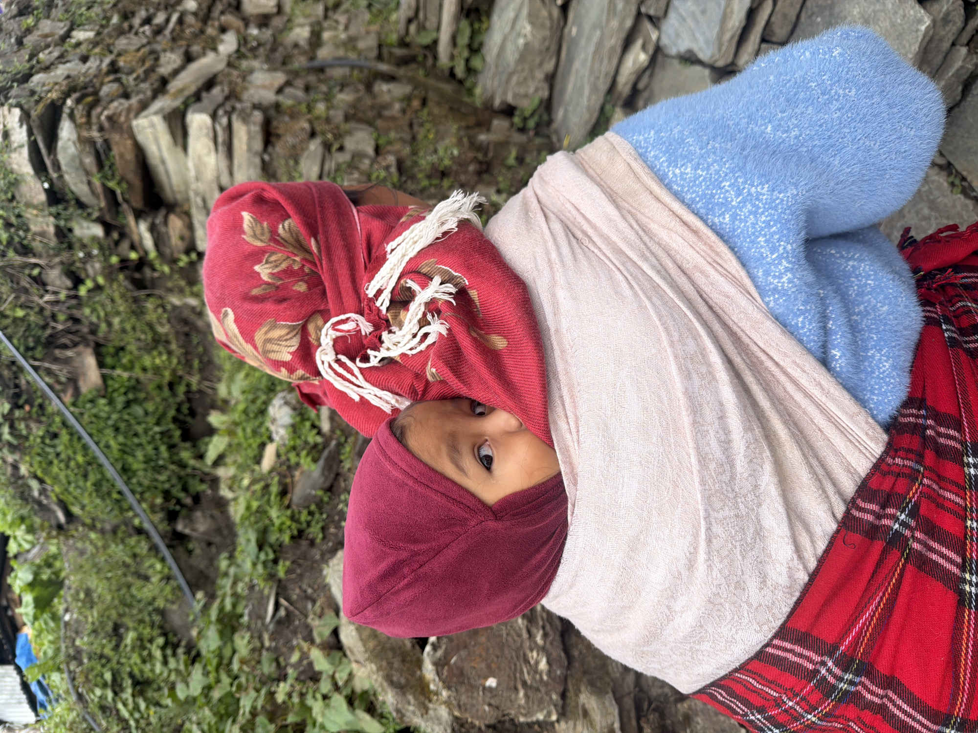 In Ghandruk, Nepal, an outdoor scene shows a woman carrying a child on her back