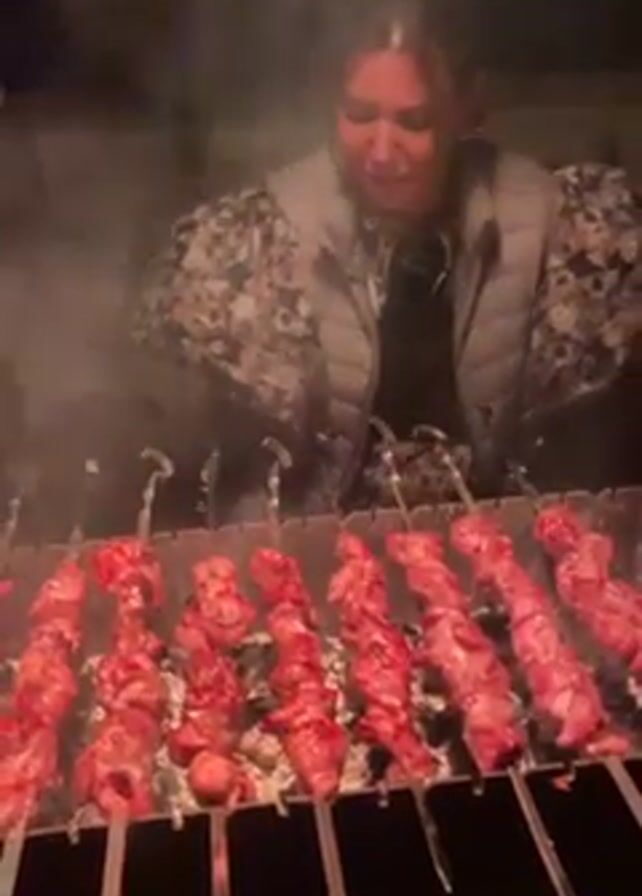 A woman is cooking skewers of meat over a grill. Smoke rises from the grill, obscuring her face at times. She looks at the meat, smiles, and talks. The woman wears a printed blouse and a vest. The skewers are lined up on the grill, and the meat appears to be cooking.