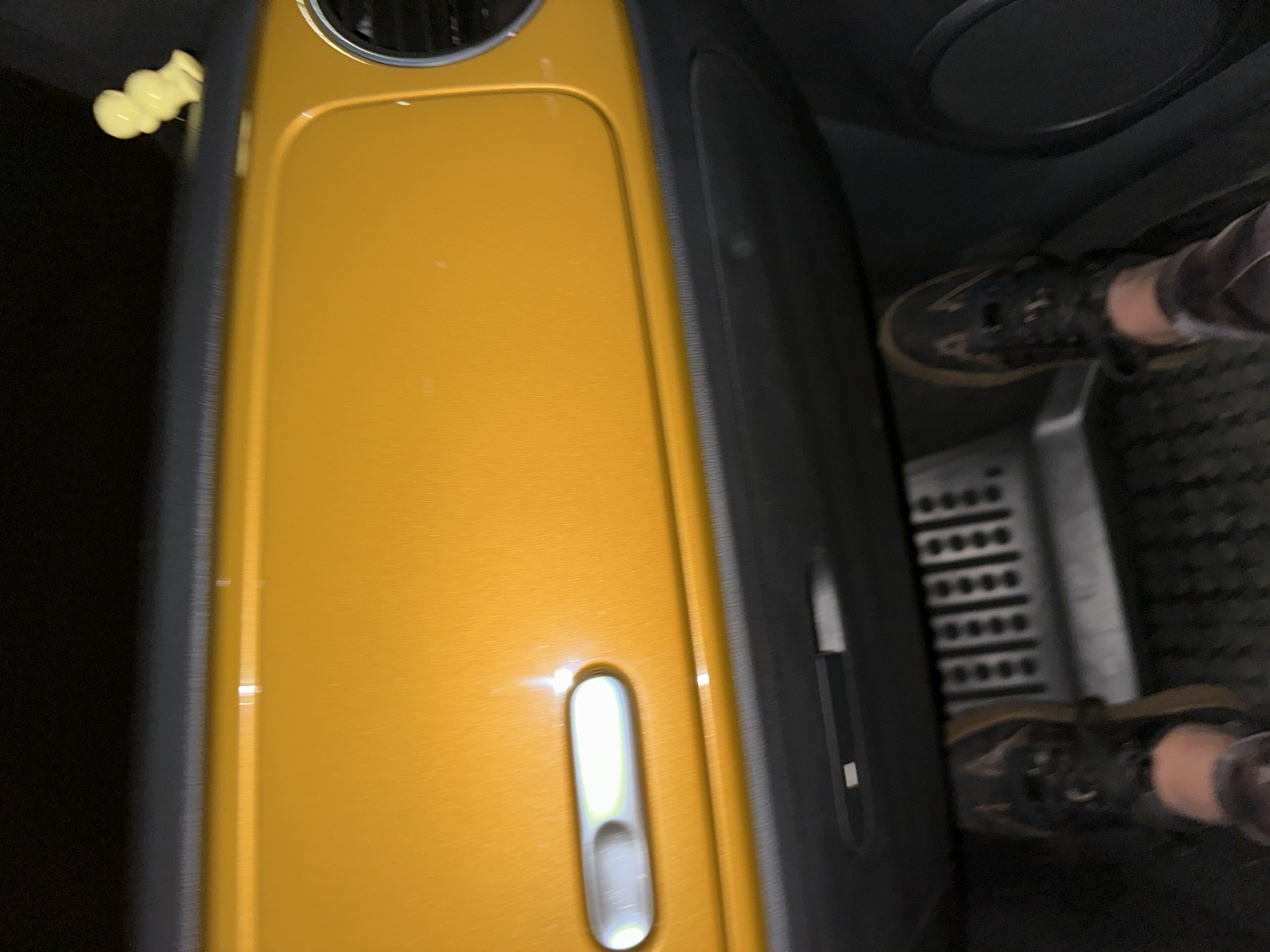 interior of a vehicle, focusing on the center console and the driver's side footwell. The center console is two-toned, with a prominent mustard yellow section and a dark gray section. A light-colored, elongated button or switch is visible on the yellow part. The footwell contains a textured floor mat and a metal footrest. A pair of dark shoes, partially obscured, rest on the floor mat and footrest. The location is not discernible from the image.
