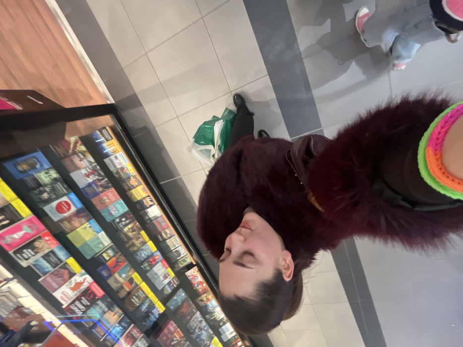 A woman wearing a maroon fur coat stands in front of a rack filled with items in cases, possibly DVDs or books. She has a dark-colored purse slung over her shoulder. Her feet are visible with black shoes. A green shopping bag rests on the floor near her. A glimpse of another person's shoes and legs can be seen in the background. The floor is tiled in light grey, and the image is taken from a slightly high, angled perspective.