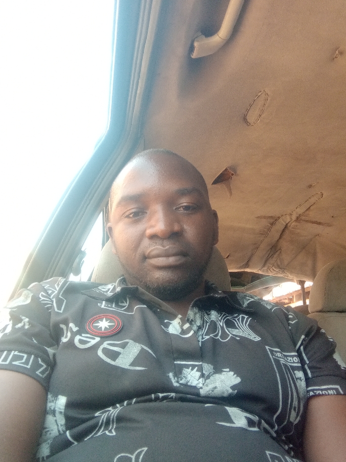 An adult male with dark skin, short dark hair, and a short beard is depicted in a selfie, seated inside a vehicle in Akwanga, Nigeria