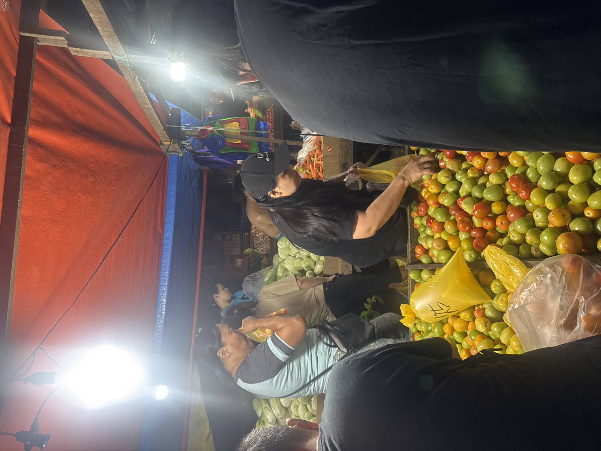 The image captures a nighttime market scene in Davao City, Philippines, under a canopy of red and blue tarpaulins supported by wooden beams. Multiple bright, bare light bulbs illuminate the area. In the immediate foreground, the backs of two individuals in dark shirts are visible, partially obscuring a large display of green and red tomatoes. A yellow plastic bag marked "125" and a clear plastic bag rest on these tomatoes. In the midground left, a man with dark hair tied back, wearing a light blue and grey shirt and a dark shoulder bag, is holding a small, orange-colored plastic bag to his nose, seemingly examining its contents by scent. Behind him are substantial piles of green leafy vegetables, likely cabbage or lettuce. To the midground right, a woman with long dark hair, wearing a black cap and a black shirt, is seen reaching into the tomato display, filling a yellow plastic bag. Behind her, a wooden crate contains carrots, and colorful fabrics are suspended from a wooden support beam. Additional individuals are present in the background among more produce stalls, including a woman in a tan shirt and another in a blue shirt. The scene depicts active commerce in a bustling, artificially lit market environment.