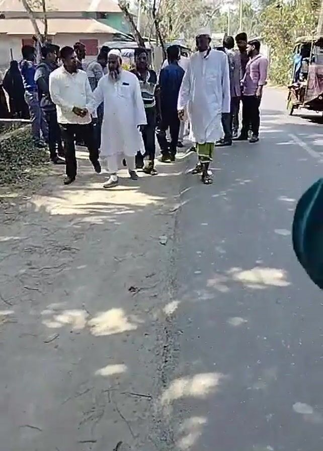 A group of men are walking along a paved road, with some men standing off to the side on a dirt shoulder. Some of the men walking are wearing traditional Muslim clothing. Several men are looking at their phones or papers. A small motorized vehicle is parked on the side of the road. There are buildings and trees in the background. The ground is covered in shadows.