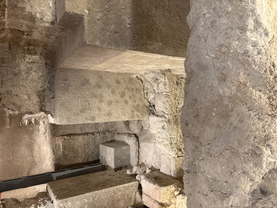 The image displays an archaeological excavation site, likely located in the city of Cádiz, Spain, featuring ancient stone and earthen structures. The perspective is from an elevated viewpoint, looking down into a subterranean or deeply excavated area. In the foreground, an uneven, light-colored earthen or concrete edge defines the immediate viewing platform. Below this, the scene reveals several prominent, roughly hewn rectangular stone blocks functioning as pillars or foundational elements. On the left, a tall, light-brown textured stone pillar stands, with a dark metal support beam or structure partially visible behind it. To the right of this pillar, a smaller, dark grey cube-shaped block rests on a raised, irregular stone base. Further to the right, another substantial light-brown stone pillar forms a corner or wall segment. The exposed ground within the excavation is uneven, consisting of layered earth and irregular stone formations, including some reddish-toned blocks visible on the lower left. The environment is characterized by exposed ancient building materials and earth, illuminated by artificial light. No people or active elements are present in the static scene.