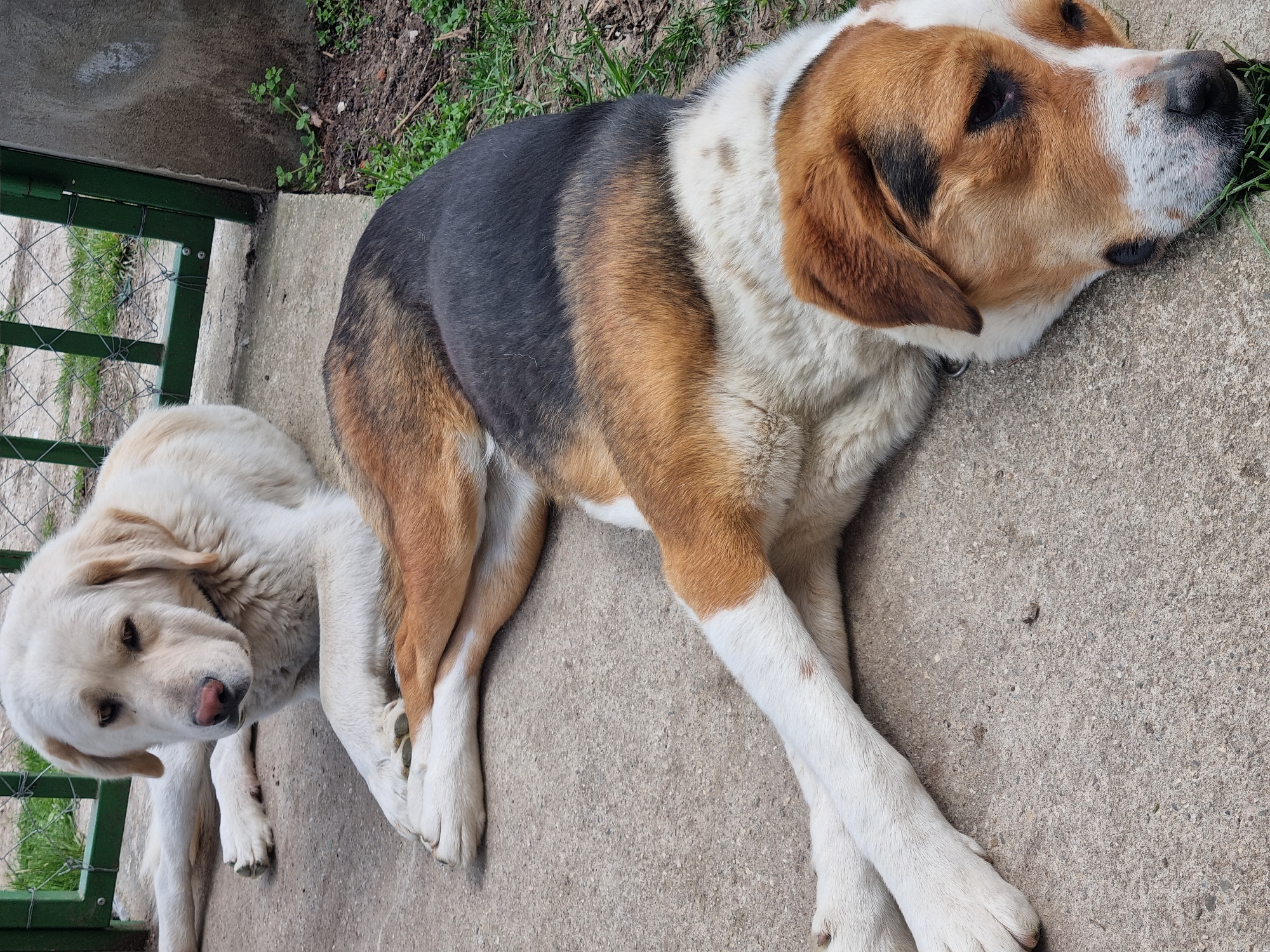 Two dogs are lying on a concrete surface. One is a large, tri-colored dog with white, brown, and black fur. The other is a smaller, white dog. A green metal fence is visible in the background. The scene is located in Galabovtsi, Bulgaria.