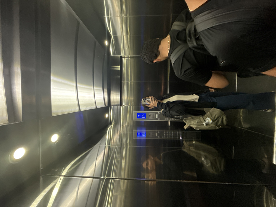 - "The scene depicts the interior of a modern elevator, characterized by reflective, brushed stainless steel walls and ceiling" by FM-Yl6102, licensed under CC BY 4.0