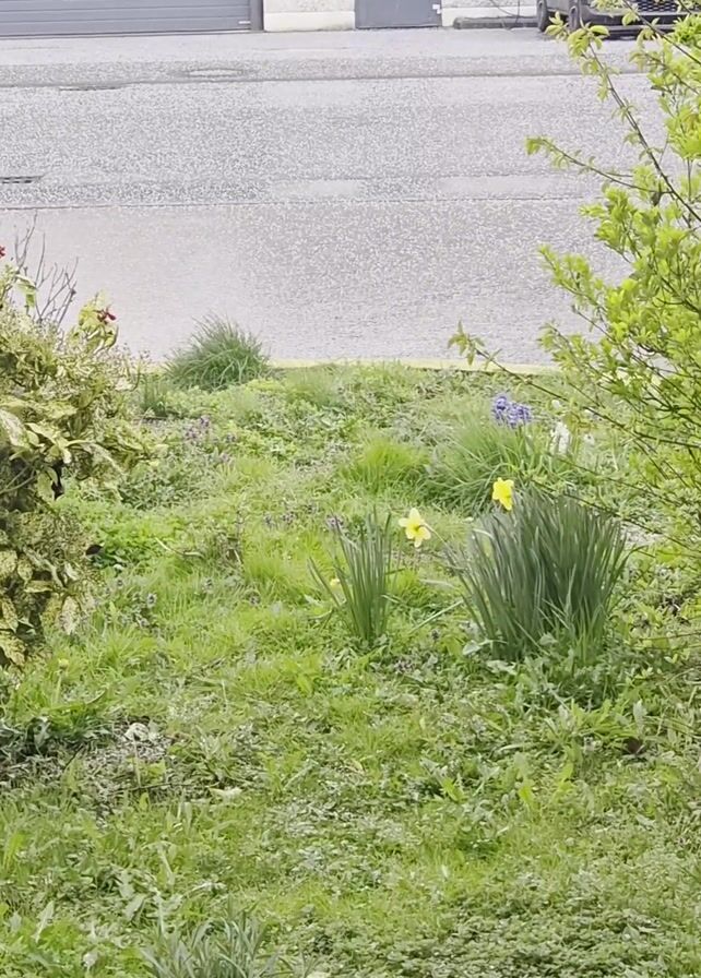 ground level view of a rainy day. There is a bed of green grass and ground cover plants, with yellow daffodils and bluebell-like flowers blooming in it. A small variegated shrub is at the left of the frame and a larger green shrub is on the right. Behind the grass is a wet gray road and across the road is a building with a gray garage door. To the right of the door, against the building, is a car that appears to be charging, a charging cord connecting it to the building. The day is gray and wet, and what appears to be very light snow or hail is falling.