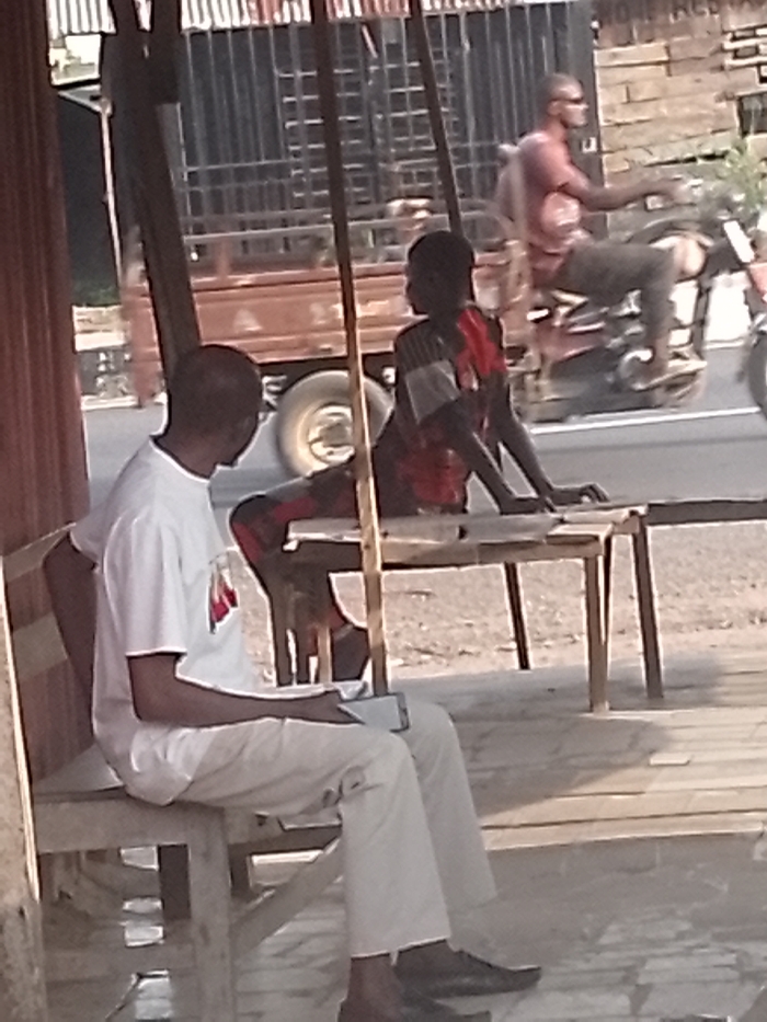 Two people are seated under a makeshift structure. One man sits on a chair wearing a white shirt and light-colored pants, holding an object. A second person is seated at a wooden table behind him. A man rides a motorcycle without a helmet on a nearby road. A truck is also visible in the background. The scene suggests an outdoor setting near a road.