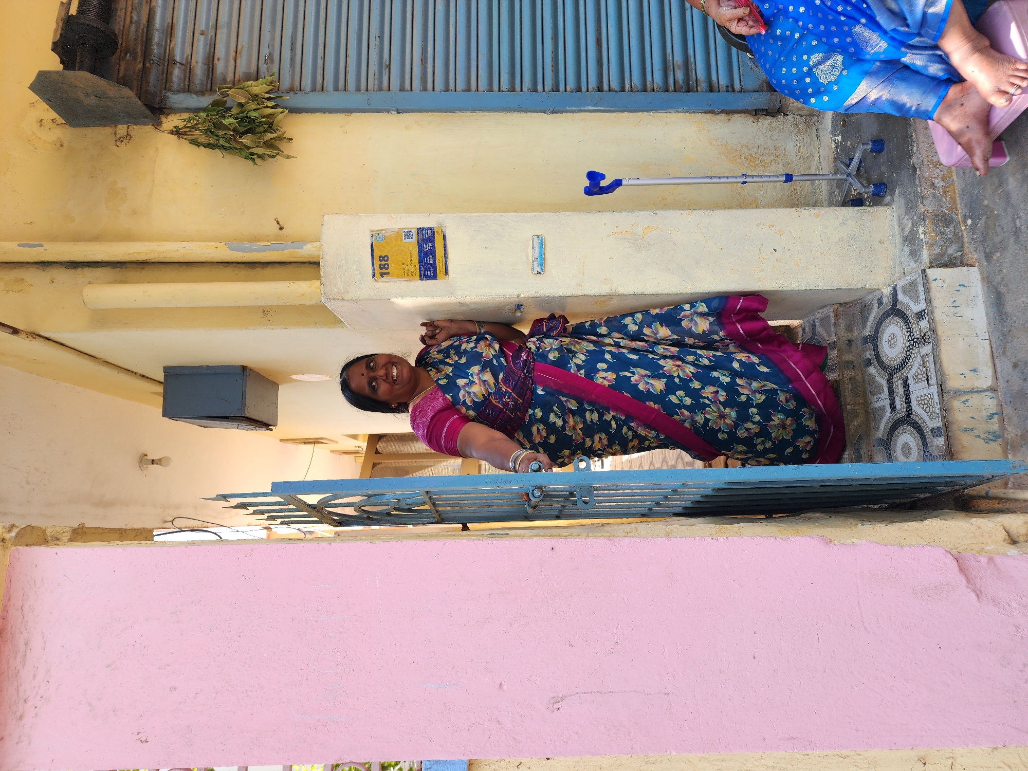 A woman stands in a doorway at a residence in Pedda Kammavaripalli, India. She is positioned slightly inside a blue metal gate, which is ajar. The woman has dark skin, black hair, and is smiling, looking towards the camera. She wears a dark blue saree with a floral pattern in light blue, yellow, and red, and a fuchsia border, over a fuchsia blouse. Gold bangles are visible on her right wrist. Her left hand rests on the pale yellow wall adjacent to the doorway, and her right hand is near the gate. To her left, a pink-painted concrete pillar forms part of the exterior wall. To her right, a light yellow wall extends, featuring a rectangular white plaque with black text and a QR code, labeled "188". Below this plaque is a smaller blue rectangular sign. Below the signs, a silver and blue quad-cane is propped against the wall. To the far right, partially visible, are the lower legs and feet of another person, resting on a pink plastic stool. This person's feet are bare, and they wear a blue saree with white patterns. The doorway entrance features two steps with patterned floor tiles. Above the cane, a blue corrugated metal rolling shutter is visible, and a small bundle of green leaves hangs from the wall above it. An exterior light fixture with a bulb is visible on the ceiling inside the doorway.