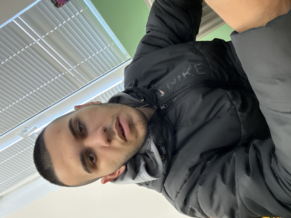 An indoor photograph features a young adult male occupying the majority of the frame, captured from a slightly low angle. He has a buzzed haircut, short facial stubble, and dark eyes, looking directly into the camera with a neutral expression and slightly parted lips. He is dressed in a black puffy jacket featuring a black "NIKE" logo prominently displayed on the upper right chest, over a visible grey hooded sweatshirt with the hood pulled around his neck. A patch of tanned skin with hair, likely from a limb, is visible in the bottom right corner of the image. The background consists of a plain white wall on the upper left, and a window fitted with horizontal white venetian blinds to the upper right, situated above a light green painted wall section. The lighting is diffused and consistent with an indoor setting. No specific identifying features of the city of Strelcha, Bulgaria, are visually present within the image.