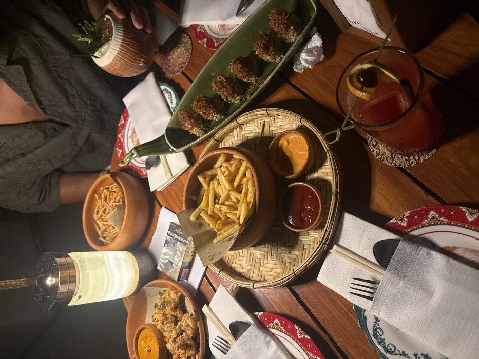 The image depicts a dimly lit wooden table in a restaurant or bar, likely in Bangkok, Thailand, given the presence of a Marlboro cigarette pack with Thai script and traditional Thai patterns on some plates and coasters. Two individuals are seated, partially visible. One person's upper torso and right arm, wearing a green patterned shirt, is visible holding a brown coconut-shaped drink garnished with mint. The table is laden with food and drinks. On the left, a small terracotta bowl contains fried chicken or calamari served with an orange dipping sauce. Adjacent to it, a tall, cylindrical, glowing white lamp provides ambient light. A pack of Marlboro cigarettes rests near the lamp. Towards the center, a round woven bamboo tray holds a terracotta bowl filled with French fries, along with two smaller terracotta bowls containing red ketchup and an orange-colored dipping sauce. To the right of this tray, a long, green, leaf-shaped dish contains six individual portions of fried, cylindrical food items topped with crispy strands. Further right, a red cocktail with ice, an orange slice, and a red cherry garnish is visible on a coaster with a Thai pattern. Various white napkins, some holding silverware (forks and spoons) and chopsticks, are placed around the table on plates with red and green Thai-patterned rims. Another bowl of French fries is partially visible in the upper center, suggesting more food on the table.
