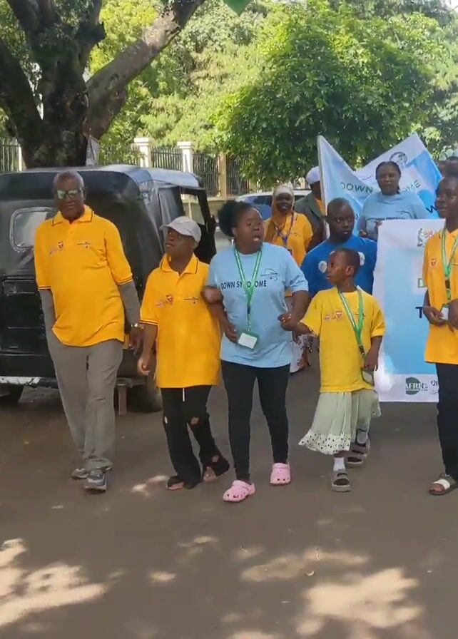 A group of people of various ages, including a child, is walking down a road in a daytime parade or march