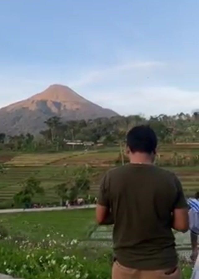 landscape with a large, brown mountain in the background under a blue sky. In the midground, there are tiered rice paddies, and closer to the camera, a man in a green shirt and tan pants is taking photos of the scenery. A young girl in a sailor dress is standing nearby, licking a lollipop. There is a wooden fence in front of them. The camera moves slightly, shifting the focus between the mountain, the rice paddies, and the people.