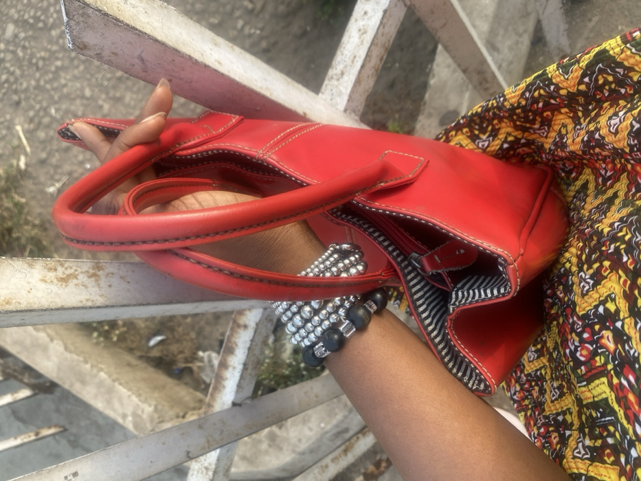The image depicts a close-up view of a person's arm and hand holding a red handbag, set against an outdoor urban background in Idiroko, Nigeria