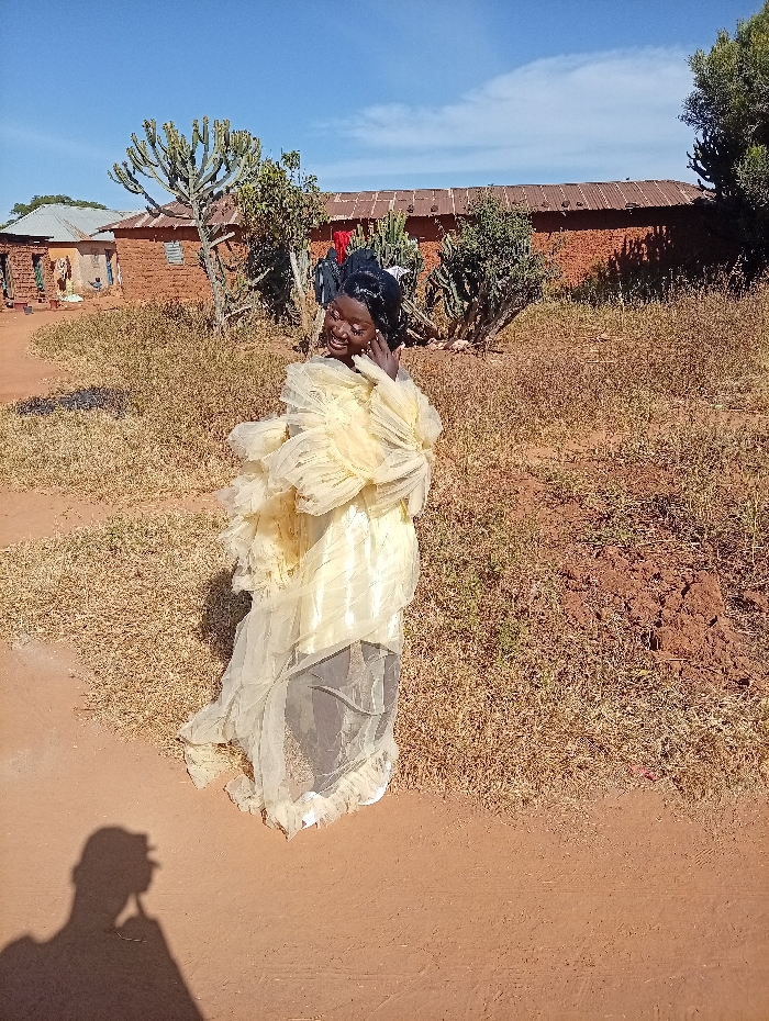 A young Black woman stands on a reddish-brown dirt path in Kerang, Nigeria, under a clear blue sky with sparse white clouds. She is dressed in a voluminous, layered light yellow or cream-colored sheer gown over a darker undergarment, with dark braids or locs in her hair. Her right hand is raised near her face, and she displays a broad smile with her eyes partially closed. The background features several single-story, reddish-brown mud-brick buildings with corrugated metal roofs, interspersed with dry, sparse grass, various bushes, and several large, multi-branched succulent plants resembling cacti. Red clothing is visible hanging to dry on a line near one of the buildings. A distinct shadow of a person, likely the photographer, holding a smartphone, is cast onto the dirt in the lower-left foreground.