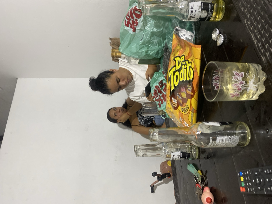 Two women are seen in the image. One with her hair up in a bun appears to be looking at her phone, while the other is looking at the camera. There are multiple empty beer bottles and a bag of "De Todito" chips on a dark surface. There is also a green plastic bag, a full glass, rings, keys and a remote control. The wall is white.