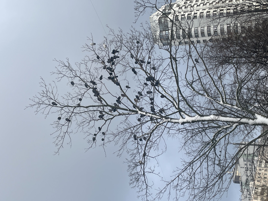 The scene is an urban winter landscape near Mosfilmovskaya Street, Moscow, Russia. A large, bare deciduous tree, its trunk and branches partially coated with snow, dominates the foreground. Approximately fifty to sixty rock doves (pigeons) are perched throughout its leafless branches; most are dark grey, with several lighter or white individuals observed. In the mid-ground, a tall, multi-story white residential building with a distinctive curved, multi-paneled glass top, identified as the 'House on Mosfilmovskaya', is visible on the right. A lower-rise building with a light facade and sloped roof is partially visible in the left background. The sky is uniformly overcast and grey. Sparse bare trees and a thin wire traverse the mid-upper background. No human figures are present.