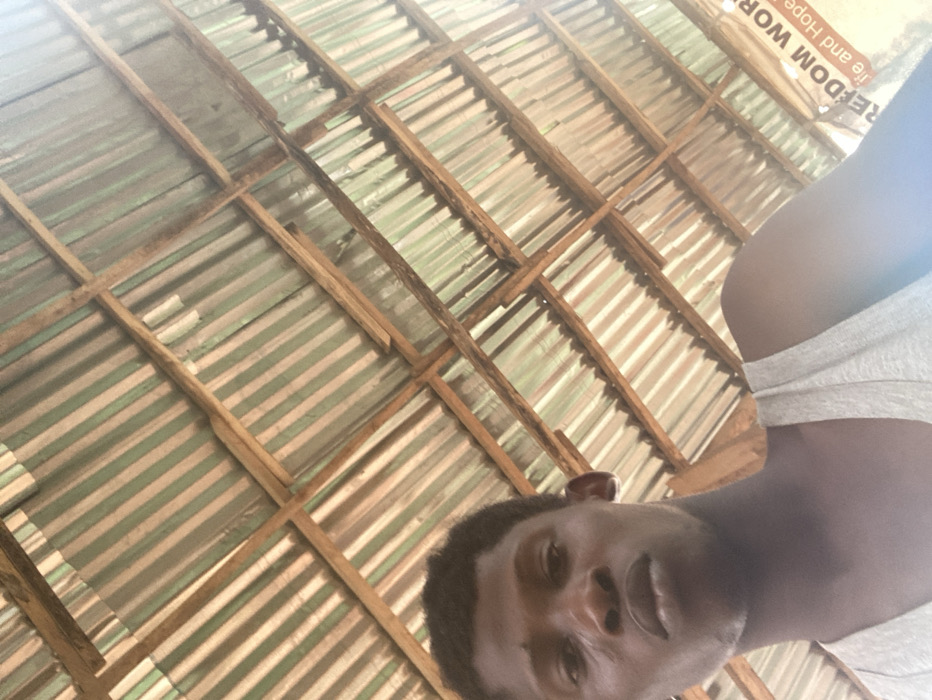 This image, captured in Agege, Nigeria, features a young, dark-skinned male in a head-and-shoulders composition. He is positioned in the lower-left foreground, looking directly towards the camera with a neutral expression. He has short, dark hair and a visible linear scar on his upper left cheek. He is wearing a light-colored, sleeveless undershirt. The background depicts an overhead view of a roof structure. This roof is constructed from corrugated metal sheets, some displaying distinct green and white striped patterns, supported by a visible grid of wooden beams. In the lower-right quadrant, partially visible and inverted text reads "FREEDOM WO" and "life and Hope", indicating part of a sign or banner within the environment.
