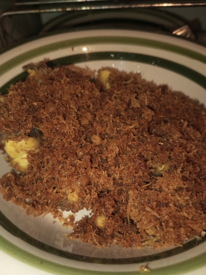 The scene is located in Benshingmo_Jomtsang, Bhutan. A close-up view shows a round, white ceramic bowl with two dark green concentric stripes on its rim. The bowl contains a prepared dish, predominantly covered by a dense, moist mass of finely shredded, brownish-orange material, consistent with grated coconut. Interspersed within this material and partially visible underneath are several distinct yellowish fragments and darker, undefined components. The background is dark and out of focus, with a horizontal metal grate or rack discernible in the upper portion of the frame. No individuals, specific actions, or interactions are present in the image.