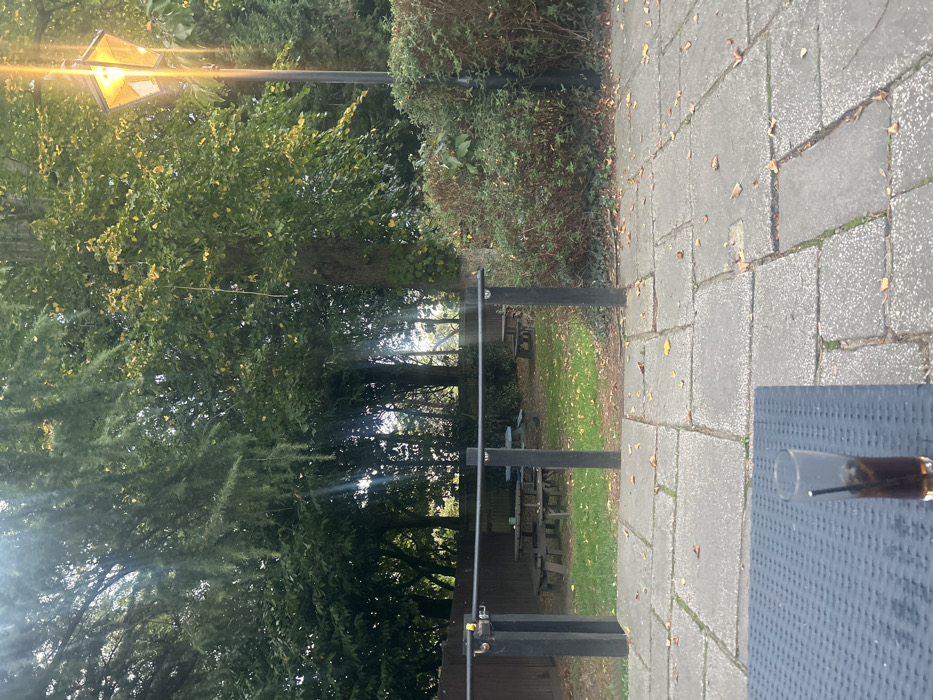 The image displays an outdoor seating area, typical of a pub garden or restaurant patio, situated in Welwyn Hatfield, United Kingdom. In the immediate foreground, a dark, textured outdoor table holds a tall glass with a dark, iced beverage and a black straw. The ground is a grey flagstone patio scattered with brown and yellow autumn leaves. A black metal railing separates the patio from a grassy lawn area beyond. This lawn contains at least three wooden picnic tables; one is blue, others are natural wood. A wooden fence borders the left side of the lawn, while dense green shrubbery defines the right. A black lamppost with an illuminated amber lantern stands to the far right. The background features mature trees with green and yellowing foliage. Bright sunlight causes lens flares in the upper left and around the lamppost. No individuals are present in the scene.