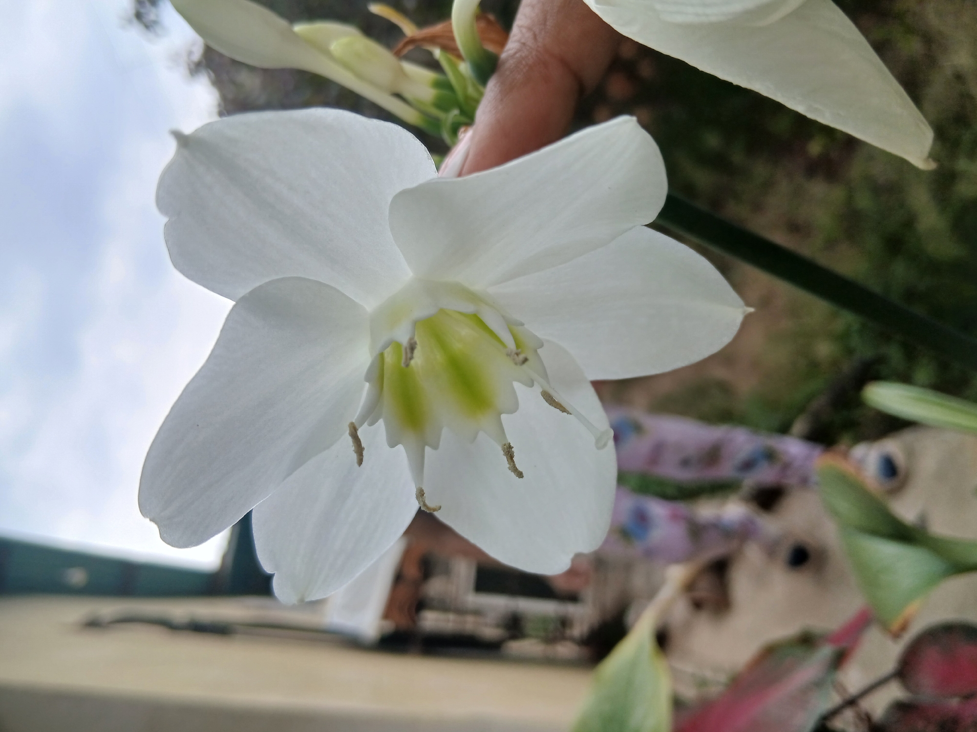 The image features a close-up view of a white flower with six petals and a greenish-yellow center. There is a human hand holding the flower. The background is blurred and includes foliage and what appears to be a partly cloudy sky. The location appears to be Apartaderos, Venezuela.