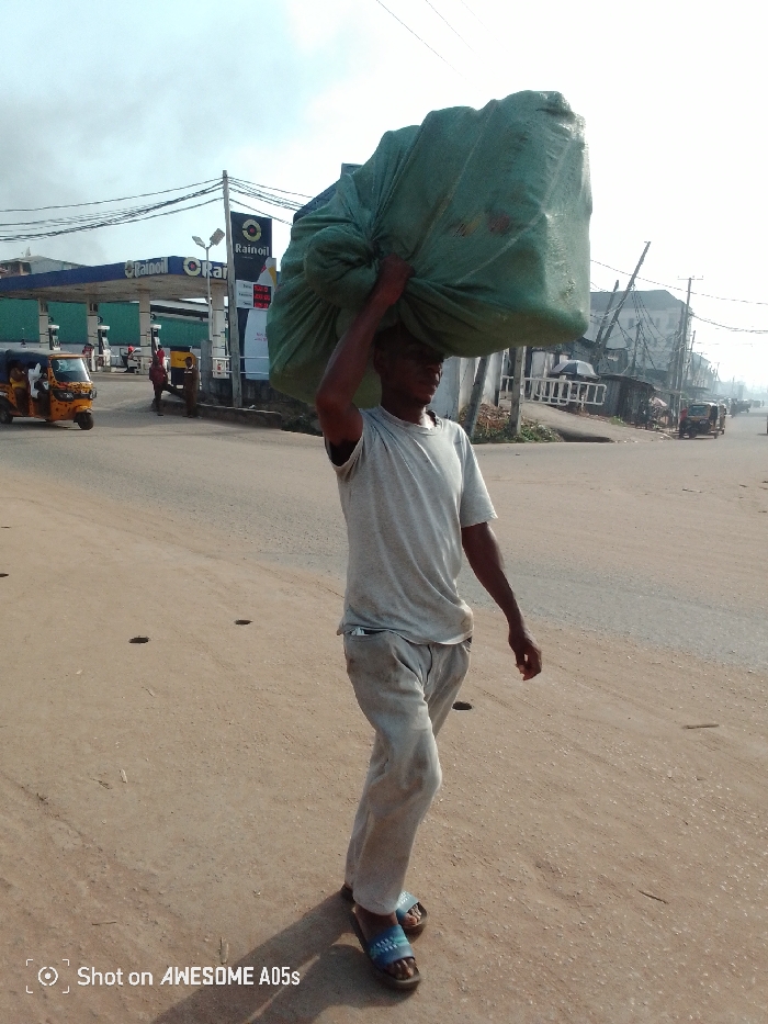 - "An adult man in a t-shirt, trousers, and sandals walks on a dusty street with a large green bag balanced on his head" by FM-libCE3, licensed under CC BY 4.0