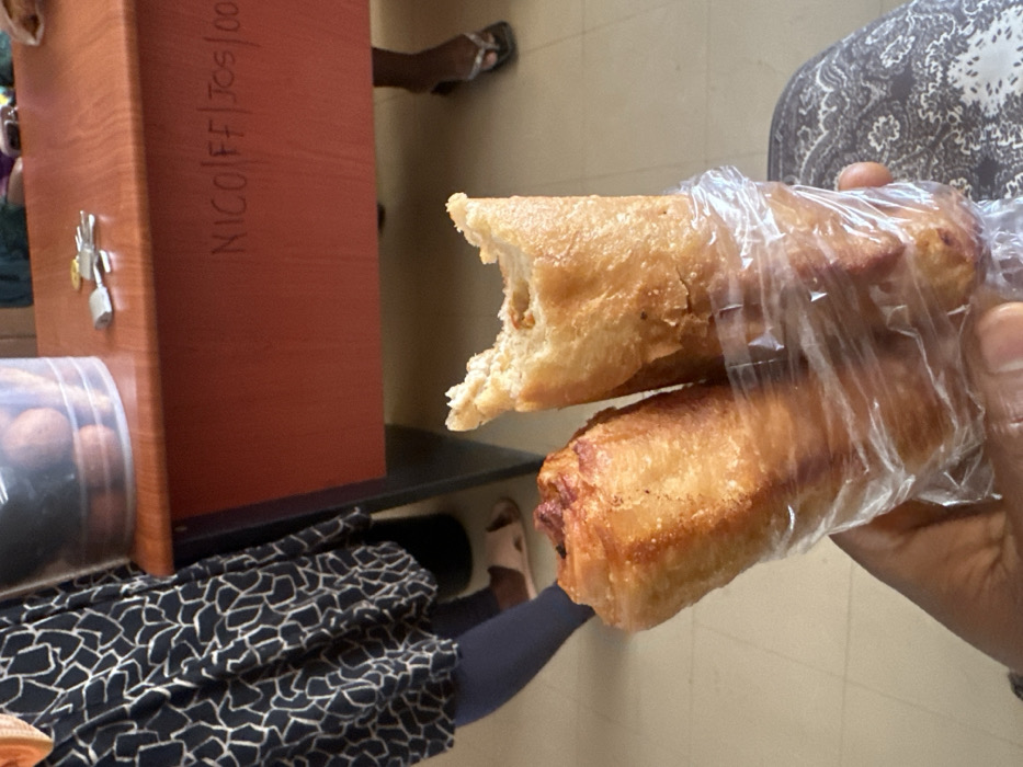 - "The image presents a close-up, first-person perspective of a dark-skinned hand holding two golden-brown, elongated fried pastries, wrapped together in a clear plastic bag" by FM-Nk0Z32, licensed under CC BY 4.0