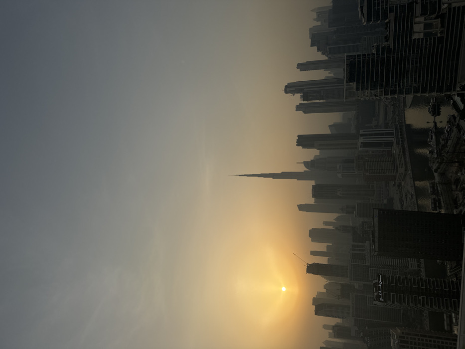 A high-angle cityscape at sunset, showcasing numerous high-rise buildings silhouetted against a golden-hued sky. Dominating the skyline is a tall, slender tower, likely the Burj Khalifa. Smog or haze obscures the details of the city. A bright sun casts a warm glow, positioned low on the horizon, and there are several cranes visible near some buildings. The scene evokes a sense of urban grandeur.