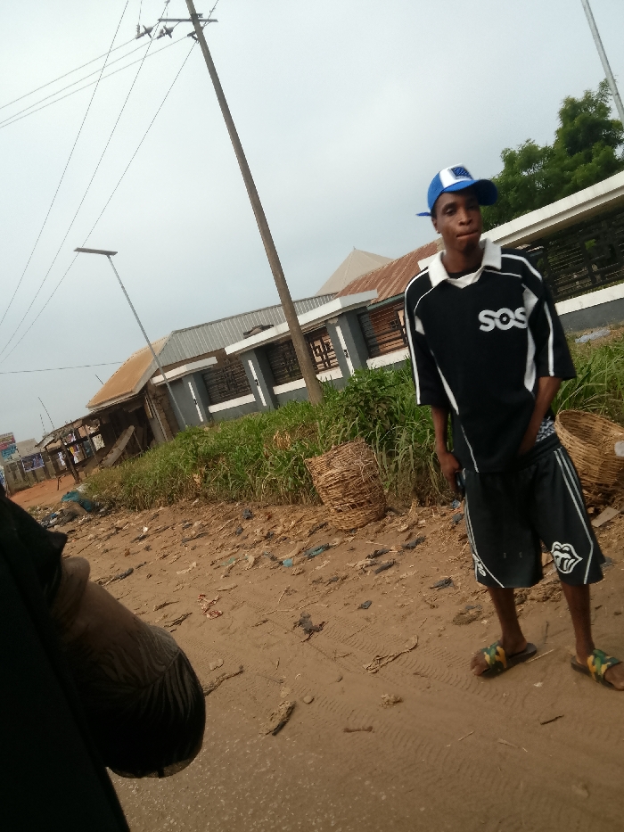 A young man stands on a dirt road wearing a blue and white baseball cap, a black shirt with "SOS" in white letters, black shorts with a Rolling Stones tongue logo, and flip-flops. He has his hands in his pockets. Behind him are buildings, greenery, and woven baskets. The ground is littered with trash. A power pole and lines are in the background. Another person's arm is visible in the bottom left corner.