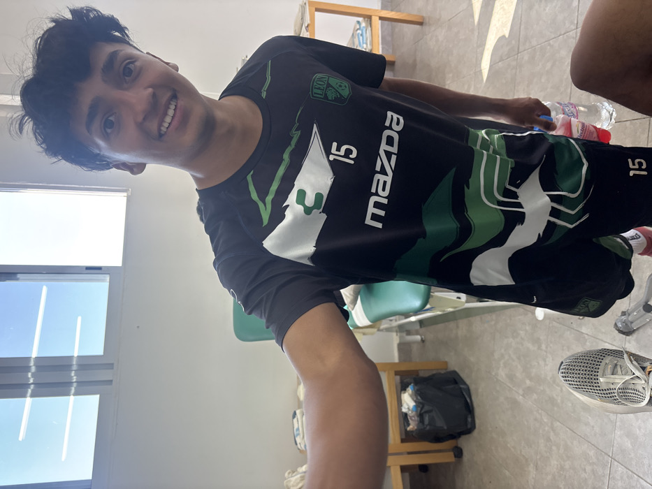 The scene takes place indoors, within what appears to be a medical examination or physical therapy room in Las Crucitas, Mexico. A young male subject, with dark, wavy hair and a medium complexion, is positioned centrally, smiling directly at the camera. He wears a black and green short-sleeved athletic jersey featuring the number "15", "MAZDA" sponsor branding, a "LEON" lion emblem, and a "Charly" logo. He is also wearing matching black and green athletic shorts, with "15" visible on the lower left leg. In his right hand, he holds two plastic bottles, one containing clear water and the other a red sports drink. Behind the subject, a green medical examination table is present. To the left, a wooden side table has a black trash bag underneath, containing various items. To the right, another wooden side table holds stacked white linens or papers. The room's walls are white, and the floor is composed of light-colored tiles. A large window with horizontal panes on the left wall illuminates the room with natural light, revealing a clear blue sky outside. In the lower left foreground, a grey and white athletic shoe is visible. A metallic medical crutch or support device is partially visible on the tiled floor near the subject's right leg.