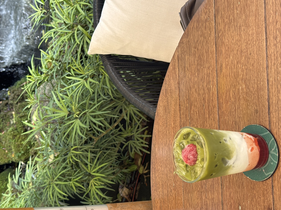 A tall, layered beverage in a clear glass is centered on a round, light brown wooden table. The drink features a red-pink layer at the bottom, a white layer in the middle, and a green top layer containing ice cubes and a single spherical red berry as a garnish. The glass rests on a round green coaster with a lighter green patterned design. To the immediate right of the table, a dark woven chair with a light beige cushion is partially visible. The background consists of dense green foliage with numerous elongated leaves. Behind the foliage, a cascading water feature, consistent with a small waterfall or stream over moss-covered rocks, is visible. A light brown vertical pole is partially visible on the far left. The scene is located in Nong Pa Khrang, Thailand, in an outdoor or semi-outdoor setting. No individuals are present in the image.