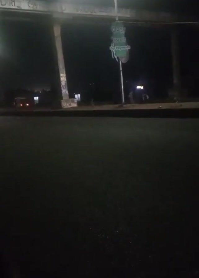 n outdoor, nighttime scene, likely in an urban or suburban area. The foreground is dominated by a dark paved surface, possibly a road or sidewalk. Above, there's an overhead structure, perhaps a bridge or signpost. There are signs visible on it with some graffiti on the support pillars. In the distance, there are blurry lights from buildings or streetlights, suggesting a built-up area. A vehicle with red taillights can be seen in the distance, but details are unclear. The video is low quality and grainy, with limited clarity. Someone walks by the camera in the foreground.