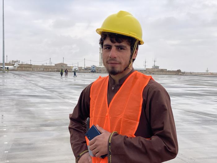 A male individual, estimated to be in his late teens to early twenties, stands in the foreground on a wet concrete airfield. He wears a yellow hard hat, an orange high-visibility mesh vest over a brown long-sleeved tunic, and holds a dark blue smartphone in his right hand. His dark hair, light beard, and mustache are visible; his expression is neutral, with his gaze directed forward. In the mid-ground, several indistinct figures are observed walking on the tarmac. The background features multiple aircraft, including a white twin-engine propeller aircraft on the left and at least two helicopters on the right. Along the distant horizon, low-rise buildings, perimeter barriers, a tall antenna mast, and a control tower structure with antenna arrays are visible under an overcast sky. This scene is located at an airport or military airbase in the city of Unknown, Afghanistan.