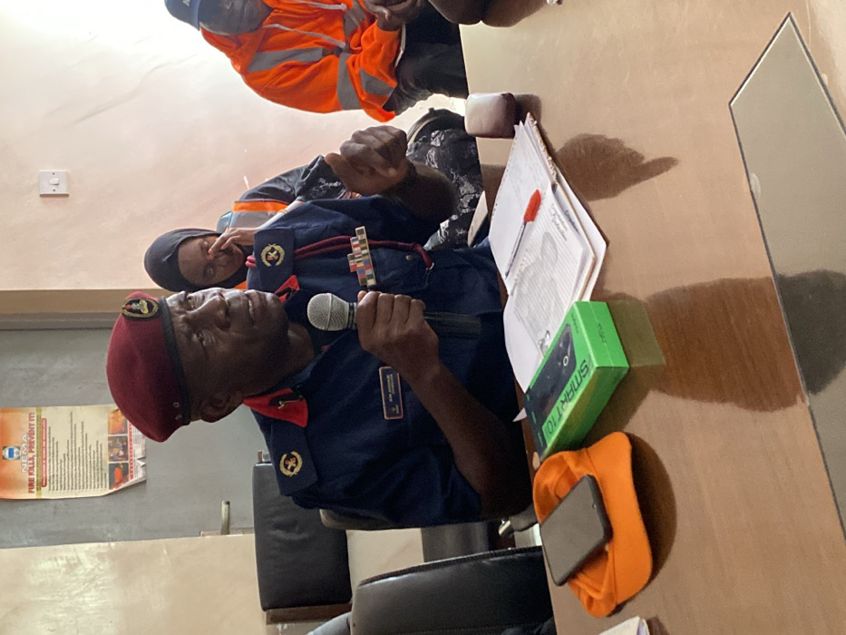 An indoor scene in Unguwar Sarki, Nigeria, depicts an adult male in a dark blue uniform with a red beret speaking into a silver microphone