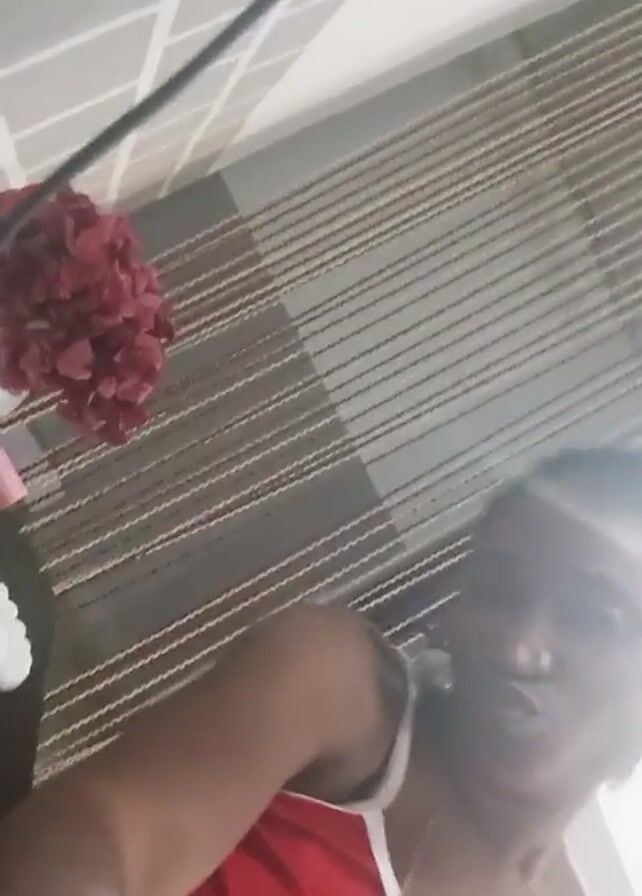 woman in a red tank top with white trim. She appears to be indoors. A red flower decoration is on a nearby table. The background features a striped wall and a decorative beaded curtain. The video is taken from a low angle, looking up at the woman, and the camera moves slightly.