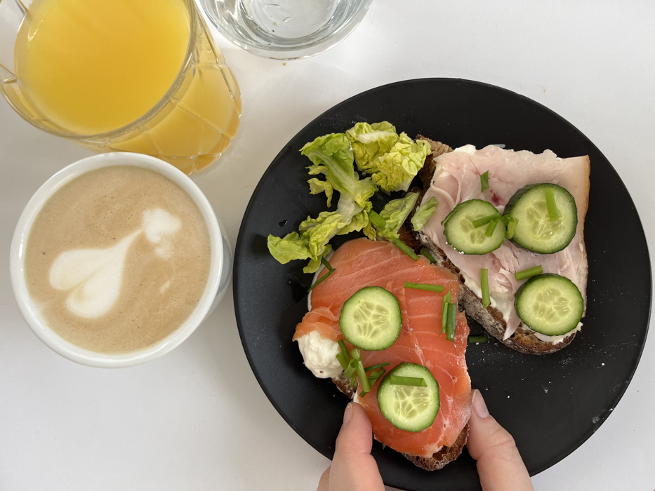 A high-angle photograph documents a breakfast or brunch arrangement on a white surface in Gangloff, Germany. The scene's focal point is a round, matte black plate holding two open-faced sandwiches and a garnish of green lettuce. The left sandwich, partially held by a human hand (specifically, an index finger and thumb), consists of a dark bread base topped with a white creamy spread, several folded slices of smoked salmon, two circular cucumber slices, and chopped green chives. The right sandwich, adjacent to the first, features a similar dark bread base with a white creamy spread, slices of light pink deli meat (likely ham), three circular cucumber slices, and chopped green chives. Between the two sandwiches, a small cluster of light green, curly leaf lettuce is present. To the upper left of the plate, a white ceramic mug contains a light brown beverage, likely coffee, adorned with a white heart-shaped latte art design on its surface. To the upper right, a clear, faceted glass jug or carafe is filled with bright orange juice. Directly to the right of the orange juice container, a smaller, clear glass holds a clear liquid, presumably water. The underlying surface is uniformly white and reflective, providing a clean backdrop for the meal.