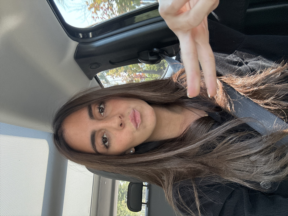 A young woman with long brown hair sits in a car wearing a black jacket and seatbelt. She holds up a peace sign with her right hand. The car's interior is visible, including the roof and rearview mirror. Outside the car window, trees and sky can be seen. The woman has fair skin, brown eyes, and full lips. She wears a small earring. The image appears to be taken from an angle, as the woman's face is tilted slightly.