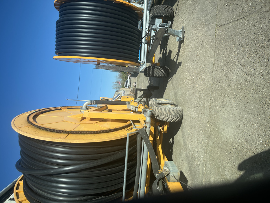The scene is located in West Suffolk, United Kingdom. The image presents an outdoor view of two large, yellow agricultural irrigation hose reel machines positioned on a concrete or asphalt surface under a clear blue sky. The machine on the left is closer to the foreground, featuring a substantial spool of black, coiled hose. Visible components include a driving chain mechanism on the spool, a hydraulic or water inlet pipe, and rugged wheels. Partially visible text "PERROT" is present on its yellow frame. To the right and slightly further back, a second, similarly designed irrigation hose reel machine is visible, also with a large spool of black hose. This machine is mounted on a silver-colored trailer frame equipped with wheels and a stabilizing jack at the front. In the distant background, to the right of center, a light-colored building is partially visible, along with a line of trees. A white vehicle is parked further down the path, and a flagpole with a Union Jack flag is discernible near the vehicle. No individuals are present in the frame. The lighting suggests bright daylight conditions.