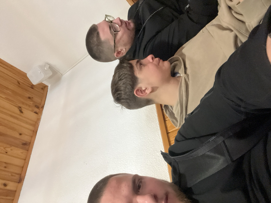 Three males are seated in an indoor setting in Kornitsa, Bulgaria