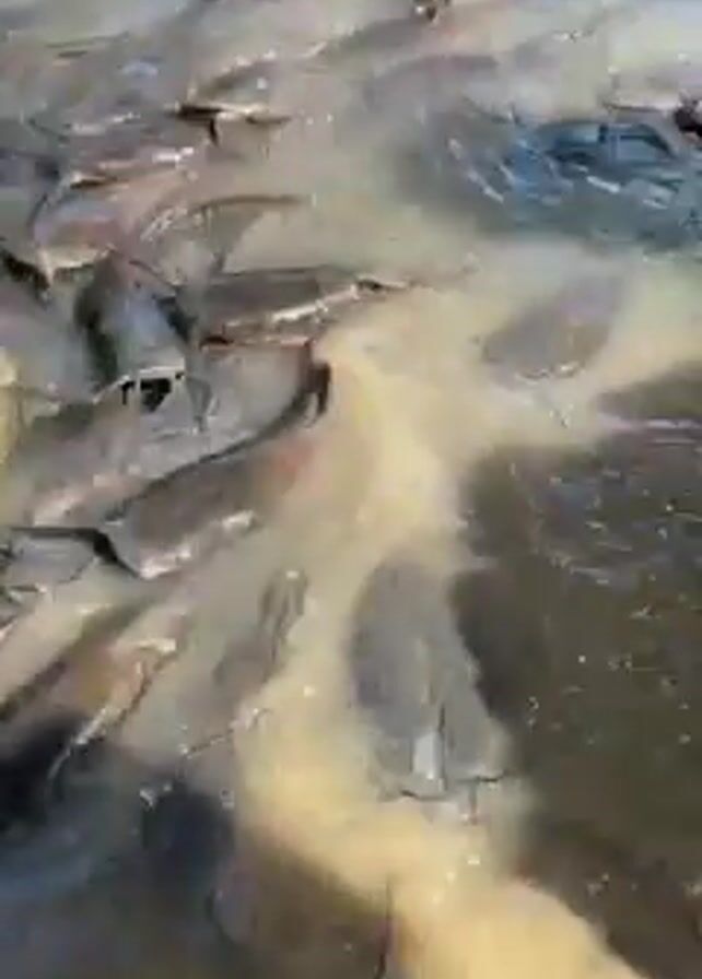 large group of fish, likely catfish, swimming and moving in murky, shallow water