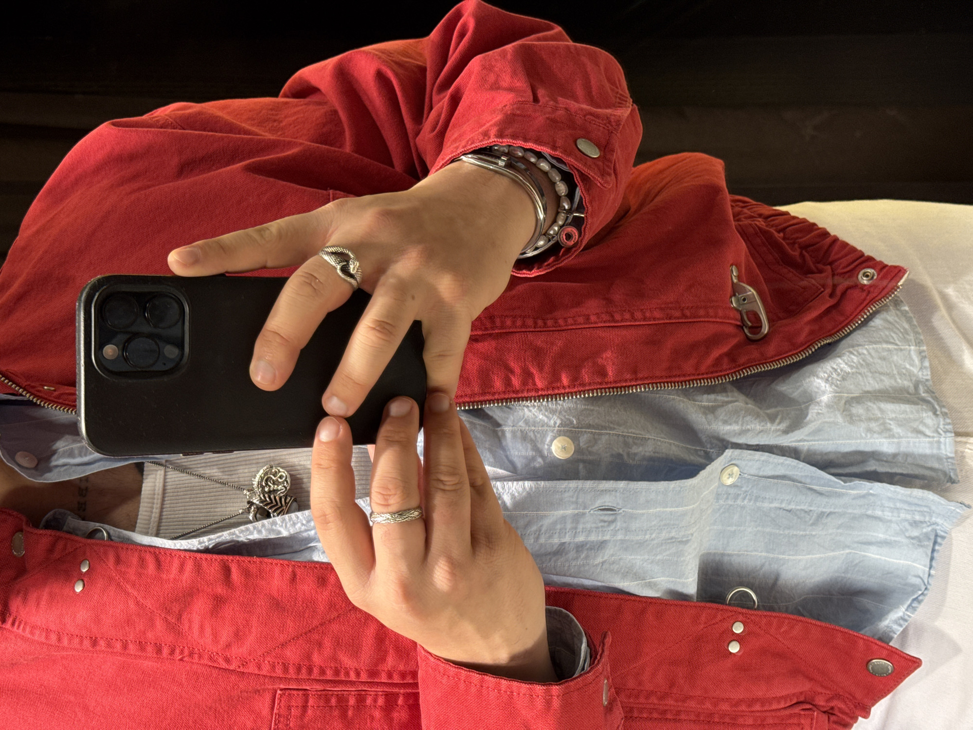 A close-up, chest-level shot captures an individual holding a black smartphone with their left hand, seemingly taking a mirror selfie. The person is wearing a red, possibly denim, jacket with metallic snap buttons and a visible zipper, layered over an unbuttoned light blue, subtly striped long-sleeve shirt. Beneath the shirt, a white ribbed undershirt is visible. Two silver-colored pendants hang from a necklace: one featuring a stylized 'R' or similar motif, and another more abstract metallic piece. A faint tattoo with text in an unidentified script is visible on the upper chest. The individual wears a silver-colored ring with a braided design on the ring finger of their right hand. On the left hand, a silver-colored ring, resembling a coiled snake or knot, is on the pinky finger. The left wrist is adorned with multiple bracelets, including several thin silver bangles, a strand of small white/cream pearls, and another bracelet with dark beads and a small heart-shaped charm. The bottom portion of the image reveals white trousers. The background is predominantly dark, suggesting an indoor setting such as a fitting room or retail space. The specific location in the city of Porto, Portugal, cannot be determined from the visual information presented in the image.
