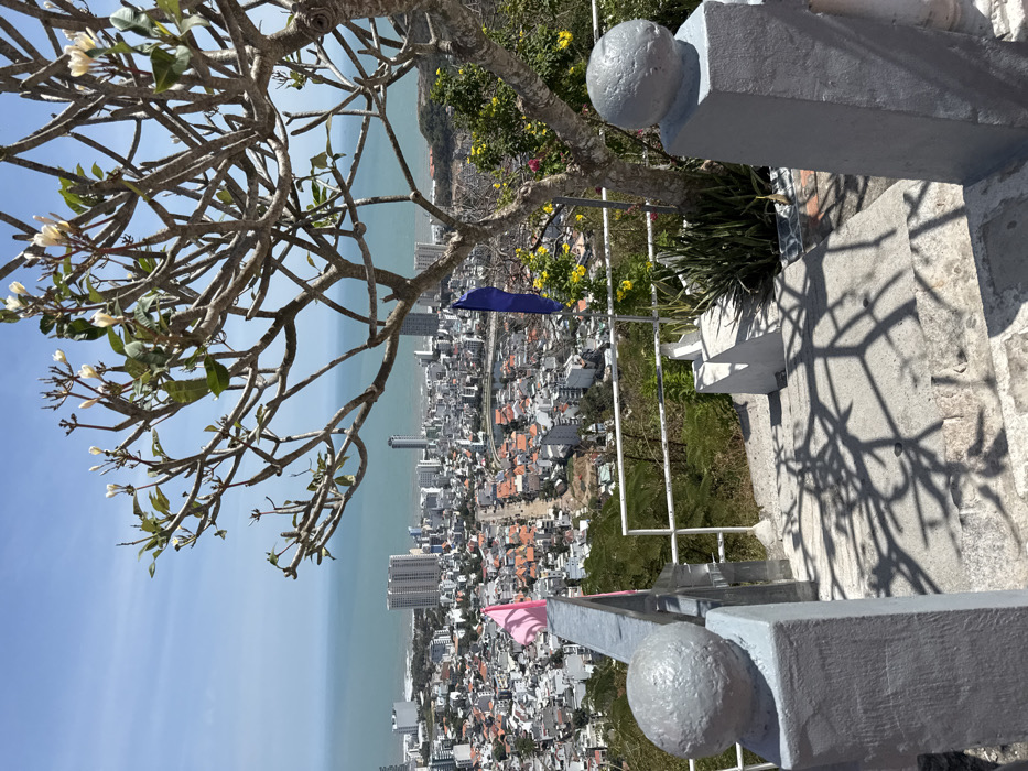 A high-angle view showcases a coastal city, framed by a tree's blossoming branches. The city extends along the coastline, meeting the sea. A stone structure with a gray, rounded top serves as the viewpoint's barrier, casting shadows on the steps nearby. Flags are on the barrier. Lush greenery and yellow flowers grow near the overlook.