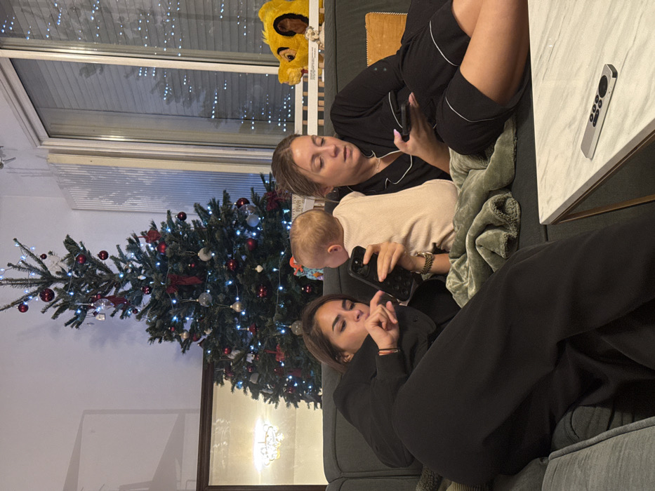Three people are relaxing on a sofa, each engrossed in their phones. A baby is nestled between two women. A Christmas tree is visible in the background. A yellow stuffed animal peeks over a child safety gate near the window. A remote control rests on a table. The individuals appear to be casually dressed in black and light-colored clothing. There is a blanket on the couch. The scene suggests a relaxed indoor setting, possibly during a holiday gathering.
