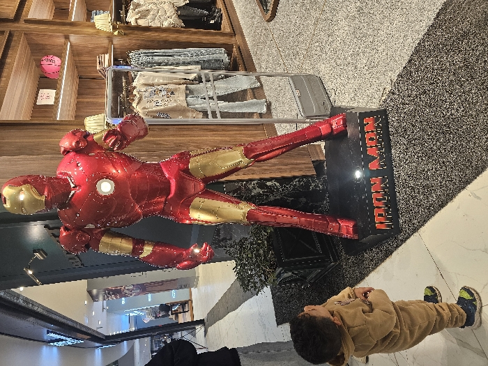 An Iron Man statue lies horizontally on a black stand labeled "Iron Man." The statue, predominantly red and gold, faces left. Behind it is a store display with clothing. To the right, a child wearing a tan outfit and blue shoes looks up at the statue. The floor transitions from gray patterned to white marble. The background shows a mall setting with multiple levels and storefronts.