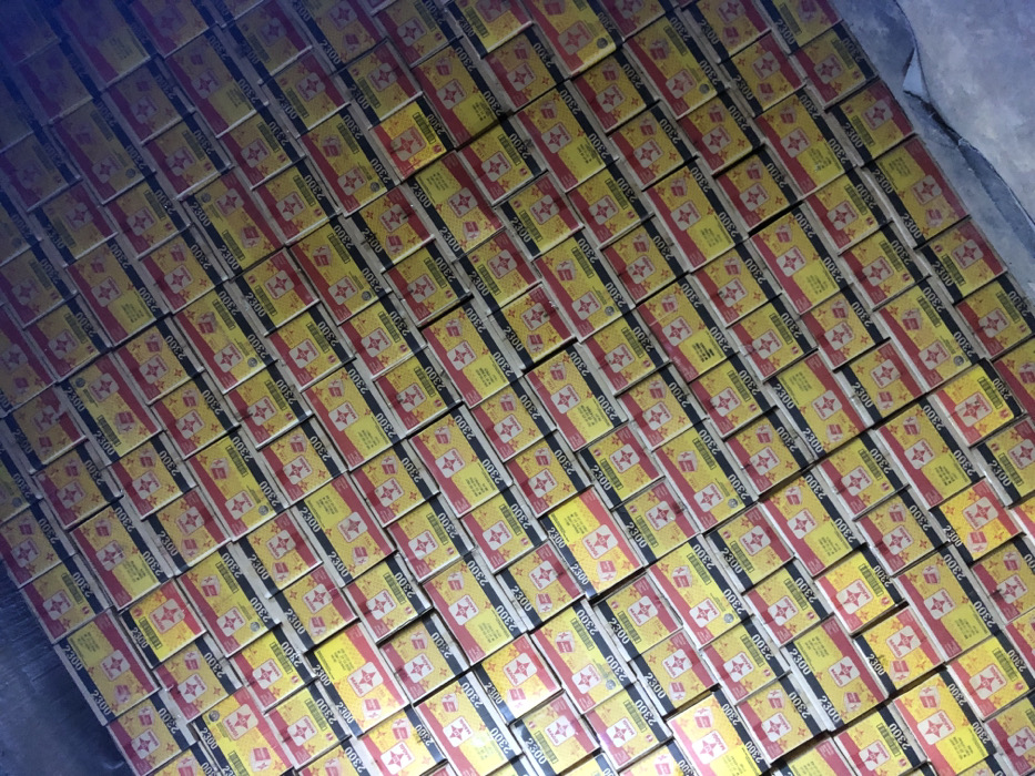 The scene in Muchiya, Nigeria, depicts a large quantity of small, rectangular product boxes