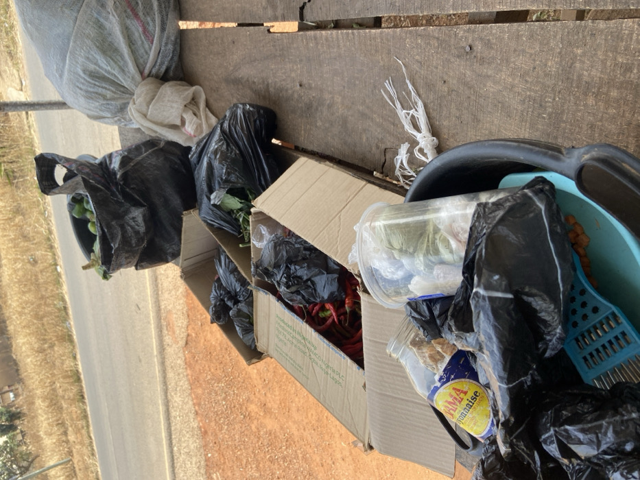 The image displays an outdoor market stall, consistent with a roadside location in Jos, Nigeria