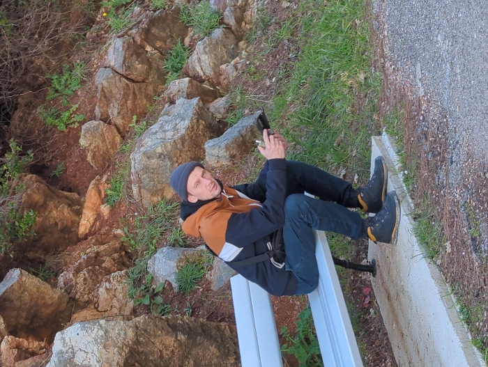 In Mirište, Montenegro, an adult male is seated on a light-colored metal park bench. He is dressed in a dark blue beanie, a hooded jacket featuring brown, white, and dark blue sections, dark blue pants, and dark boots with tan accents. A black strap crosses his left shoulder. The man holds a dark rectangular electronic device in his left hand and a metallic cylindrical object in his right hand, looking directly at the viewer. The bench rests on a concrete slab adjacent to a gravel path with green grass. The background consists of a steep, rocky hillside exhibiting grey and reddish-brown rock formations interspersed with sparse green vegetation.
